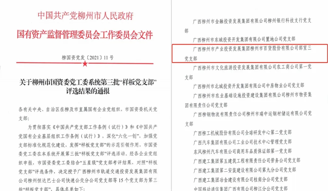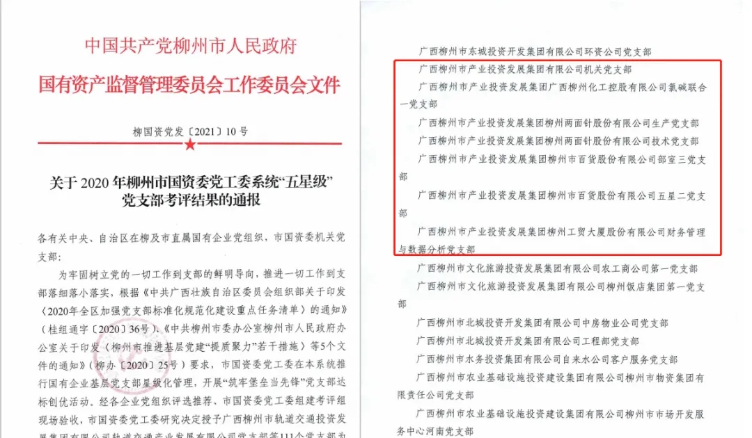 近日,市國資委黨工委先后公布了《關(guān)于 2020 年柳州市國資委黨工委系統(tǒng)“五星級”黨支部考評結(jié)果的通報》和《關(guān)于柳州市國資委黨工委系統(tǒng)第三批“樣板黨支部”評選結(jié)果的通報》。產(chǎn)業(yè)集團公司機關(guān)黨支部,產(chǎn)業(yè)集團柳化控股公司氯堿聯(lián)合一黨支部,產(chǎn)業(yè)集團兩面針公司生產(chǎn)黨支部和技術(shù)黨支部,產(chǎn)業(yè)集團百貨公司部室三黨支部和五星二黨支部,產(chǎn)業(yè)集團工貿(mào)公司財務(wù)管理與數(shù)據(jù)分析黨支部等7個黨支部獲市國資委黨工委評為“五星級”黨支部;產(chǎn)業(yè)集團百貨公司部室三黨支部獲市國資委黨工委評為第三批“樣板黨支部”。