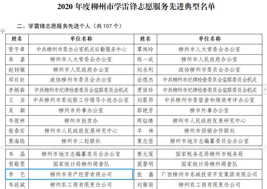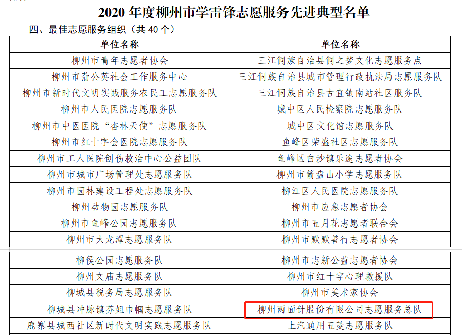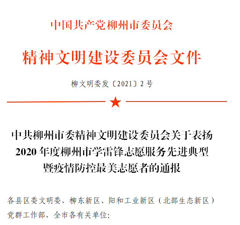 近日,柳州市委文明委發(fā)文,表揚了2020年度柳州市學雷鋒志愿服務先進典型暨疫情防控最美志愿者。在此次表揚通報中,廣西柳州市產(chǎn)業(yè)投資發(fā)展集團有限公司和柳州五星百貨股份有限公司獲評為“學雷鋒志愿服務先進集體”,柳州兩面針股份有限公司志愿服務總隊獲評為“最佳志愿服務組織”,柳州市資產(chǎn)經(jīng)營有限公司員工李藝獲評為“學雷鋒志愿服務先進個人”。